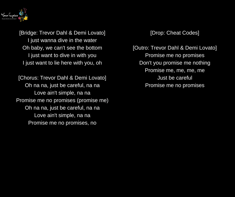 No Promises - Cheat Codes ft. Demi Lovato (Lyrics), Learn how to sing in only 30 days with these easy, fun video lessons! https://www.30daysinger.com/a/8328/BFzaEvmu -- "No . We Have got 9 pix about Promise Me No Promises Lyrics images, photos, pictures, backgrounds, and more. In such page, we additionally have number of images out there. Such as png, jpg, animated gifs, pic art, symbol, blackandwhite, pics, etc. "Calvin Harris, Sam Smith - Promises (Official Lyric Video)", Calvin Harris & Sam Smith – Promises (Official Lyric Video) Listen/download here: http://clvnhrr.is/Promises Follow Calvin Harris . "Cheat Codes & Demi Lovato - No Promises (Lyrics)", Cheat Codes, Demi Lovato - No Promises (Lyrics) // Cheat Codes - No Promises (Lyrics) ft Demi Lovato is a lyric video for Cheat ..
